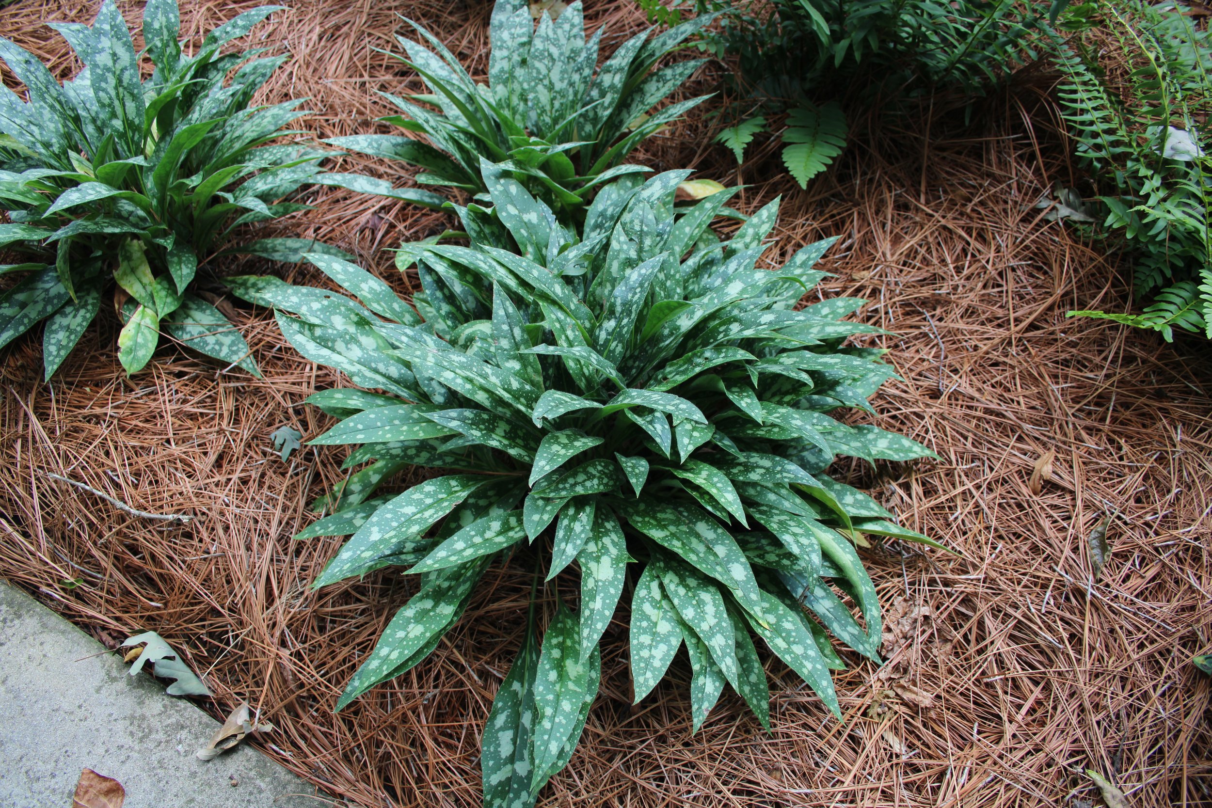 Pulmonaria is pretty even when its not blooming. Its leaves look like Hosta with freckles.