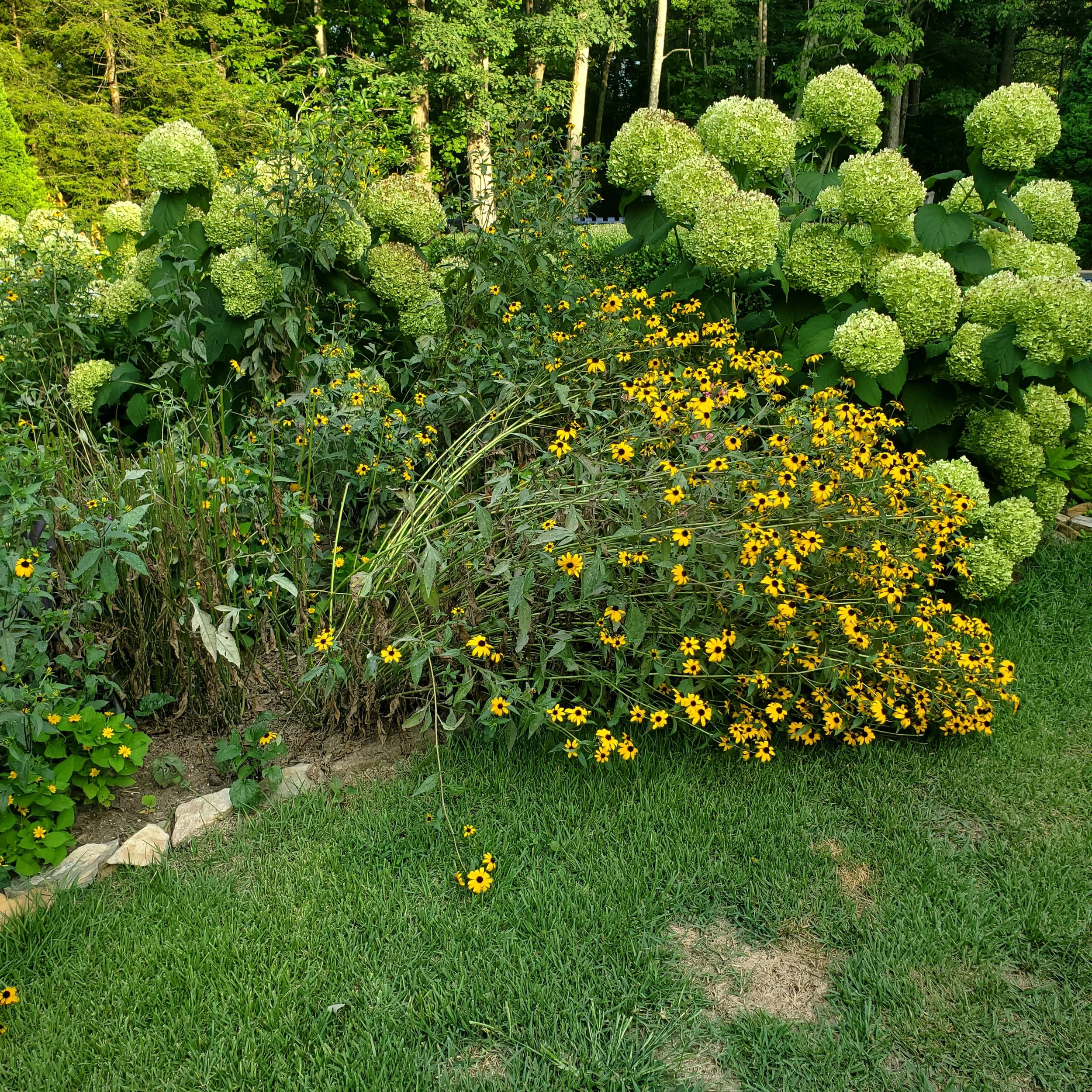 My favorite flowering shrub (currently, anyway) is Buddelia, commonly known as Butterfly Bush. Before you start criticizing this choice as invasive and non-native, let me tell you that all eight of mine are sterile, in the Pugster® family, hybrids from Proven Winners. I have the blue, which is really a shade of blue-purple. The small size makes them compatible with the perennials in my mixed beds. The ones in the pollinator bed near my orchard are four years old, and have not exceeded the labeled height of three feet.